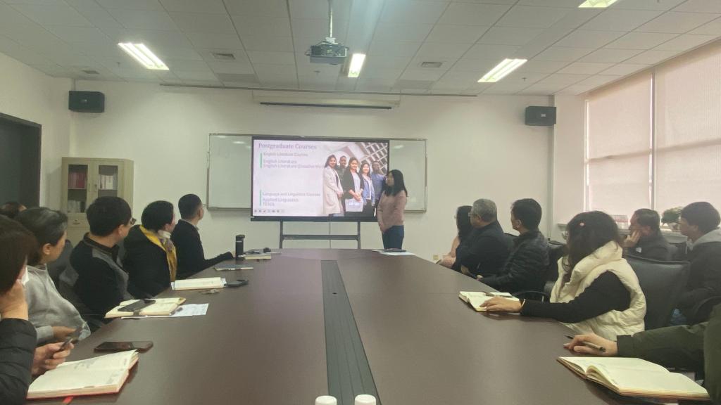 交流中,董妍妍老师首先介绍了访学院校的优质资源与学术氛围。随后,董老师重点分享了课程旁听的核心收获。访学期间,她系统旁听了秋季与春季两个学期的多门核心课程,涵盖语言教学、应用语言学、学术研究方法等多个领域。董老师特别提到,课程中涉及的《牛津英语词典》收录的“add oil(加油)”“guanxi(关系)”等中国特色英语表达案例,让她直接感受到中国语言文化在国际舞台上的影响力,也为跨文化语言教学提供了生动素材。此外,《阅读与写作教学》《教材与课程设计》《实践者研究与发展》等课程,从教学方法创新、课程体系构建、教师专业发展等维度,为她带来了兼具理论深度与实践价值的启发。